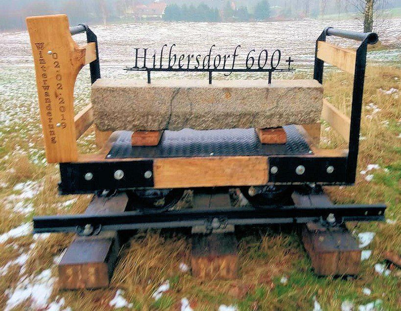 An allen Treffpunkten auch dabei, eine Kleinbahn-Lore bestückt mit einer als Wegweiser fungierenden Granitsäule. Natürlich hat das einen besonderen Grund. Bis heute wird am Rande des Dorfes Granit abgebaut und die daraus resultierenden Restlöcher prägen die Umgebung. Der Granit war und ist ein großer Arbeitgeber für viele Dorfbewohner, jahrhundertelang. Ein sozusagen steinerner Zeuge ist auch der ehemalige Verladebahnhof Hilbersdorf, der jetzt als Domizil für den Dorf- und Jugendclub dient und wo am letzten Septemberwochenende der Jahreshöhepunkt mit Festumzug, Theateraufführung und, und stattfinden soll. Gleichzeitig werden wir natürlich auch einen anderen, ebenso großen Arbeitgeber aus der jüngeren Dorfgeschichte würdigen, nämlich den Apfel. Wer kannte sie nicht, die riesigen Plantagen des Volksgutes Kunnerwitz, Betriebsteil Hilbersdorf unterhalb der Kämpfer- bzw. der Königshainer Berge. Auch der Apfel war somit jahrzehntelang die Haupterwerbsquelle für viele Dorfbewohner.